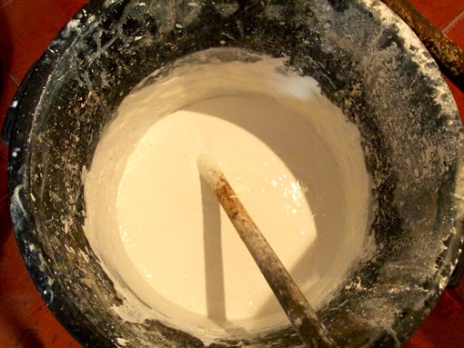 O seguinte passo foi pintar as paredes e teto. Optamos por utilizar cal. Vantagens? Mais ecológica, mais adaptada ao tipo de casa e paredes que temos e também mais economica em relação às tintas. Desvantagens? Não é comprar uma lata de cal e pintar, é preciso saber prepará-la de modo que ao segundo dia não se escame por completo. Outra desvantagem é que é necessário aplicar mais mãos de pintura.
