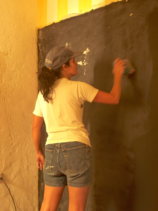 A continuación pasamos a la pared donde iba la pintura de pizarra. Aquí la cosa tampoco salió bien a la primera. No voy a entrar en detalles sobre los errores que hicimos (hice!!) y sólo dejo el consejo por si alguien algún día quiere pintar una pared con esta pintura: lo mejor es comprar la pintura especial con efecto pizarra. Nosotros hemos usado la de la marca Titan y la compramos en Acrilac en Malveira.