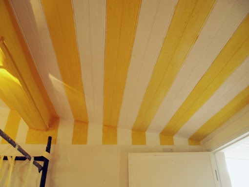 Depois de tudo caiado de branco passamos aos toques de cor. No teto decidimos pintar umas vigas de cor. Depois de dar muitas voltas às cores optamos pelo amarelo. E aqui foi onde começamos a encalhar. A tarefa é só apta para pacientes porque primeiro tivemos que marcar as riscas com fita de pintor e só depois e com pulso firme, pintar. O segundo obstáculo foi que se acabou o corante amarelo. Para encontrar a mesma marca tivemos que telefonar para meio Portugal. Depois de umas quantas mãos (e alguma dor de pescoço) conseguimos ter o teto pintado.